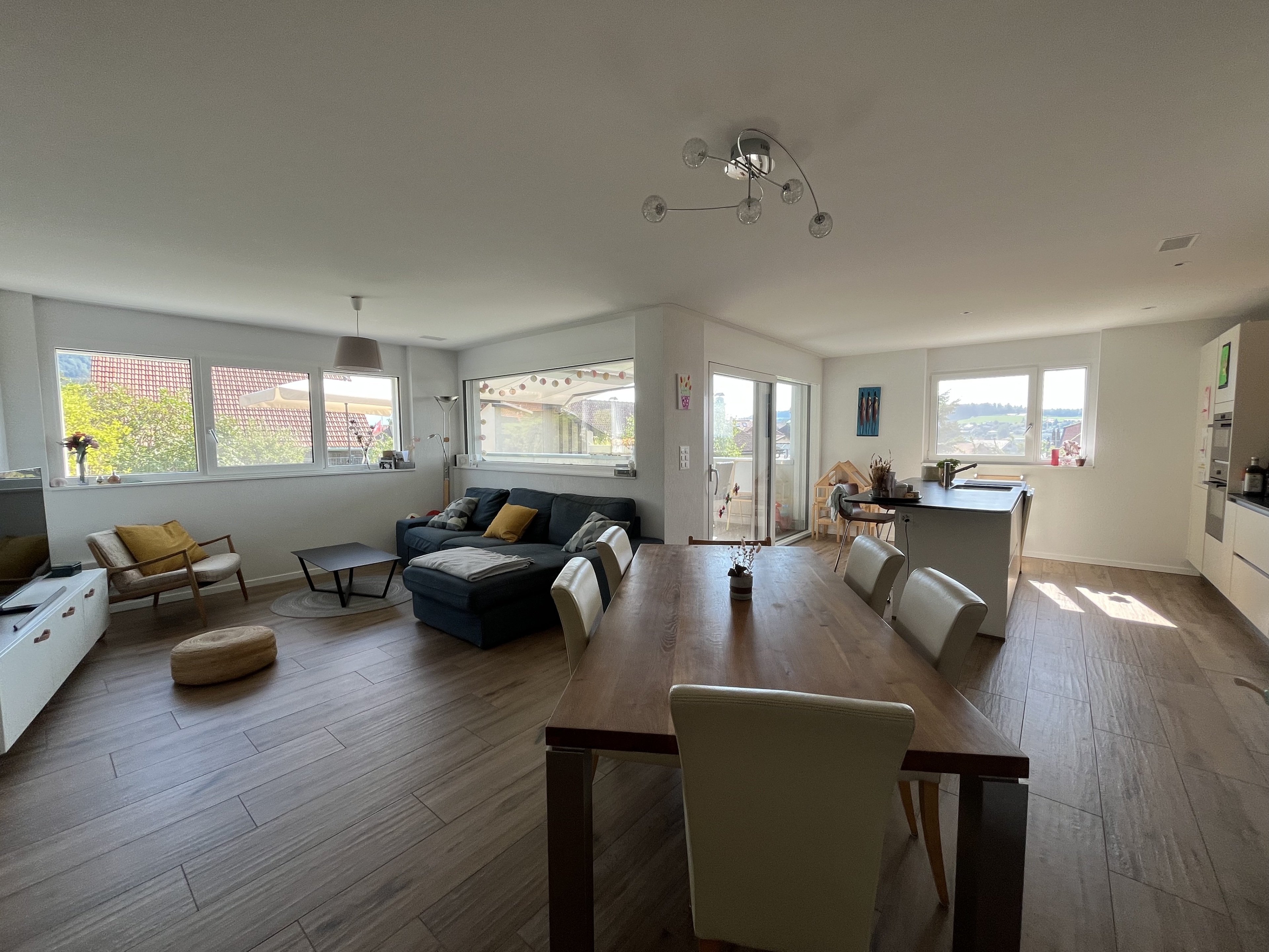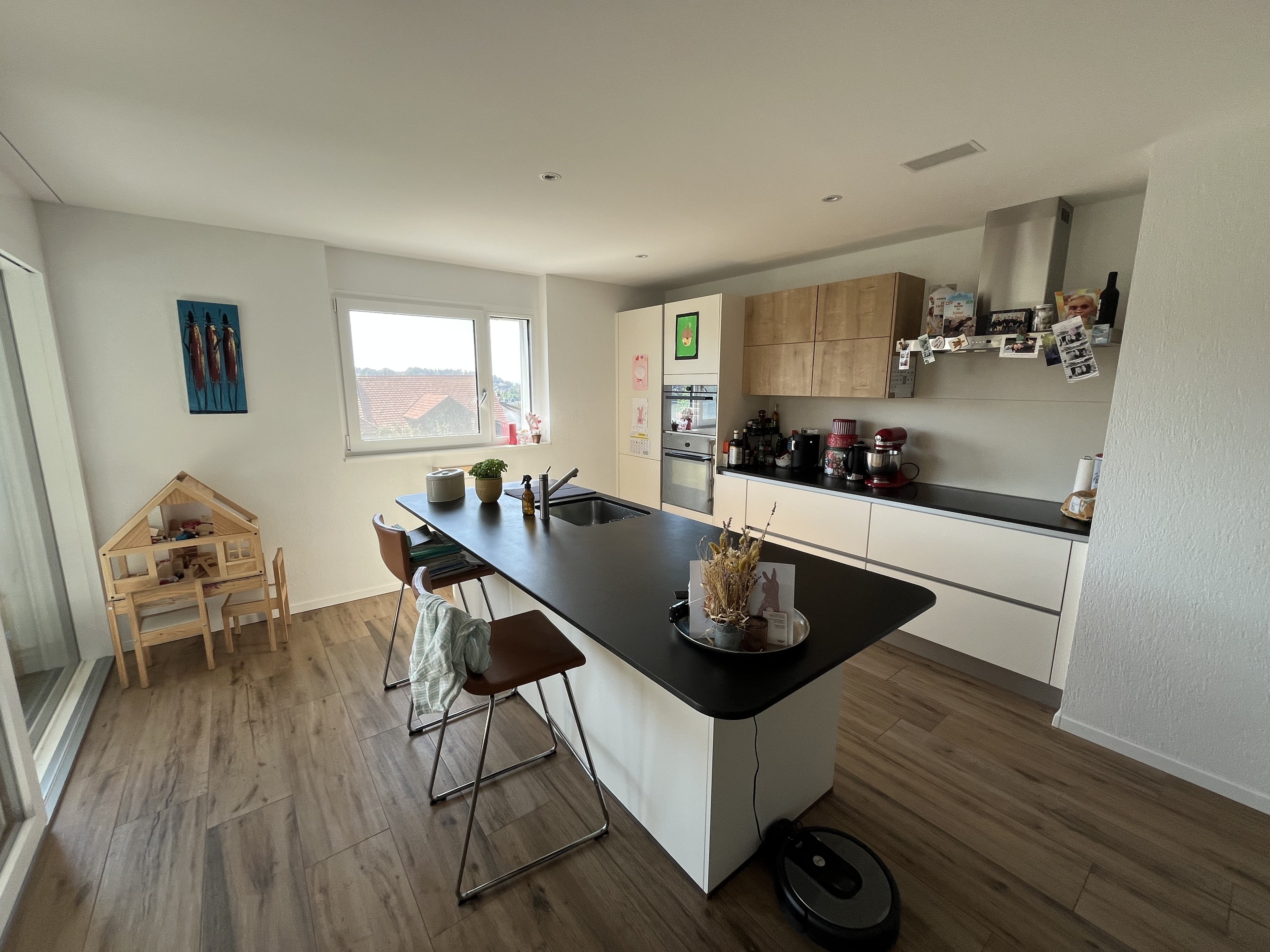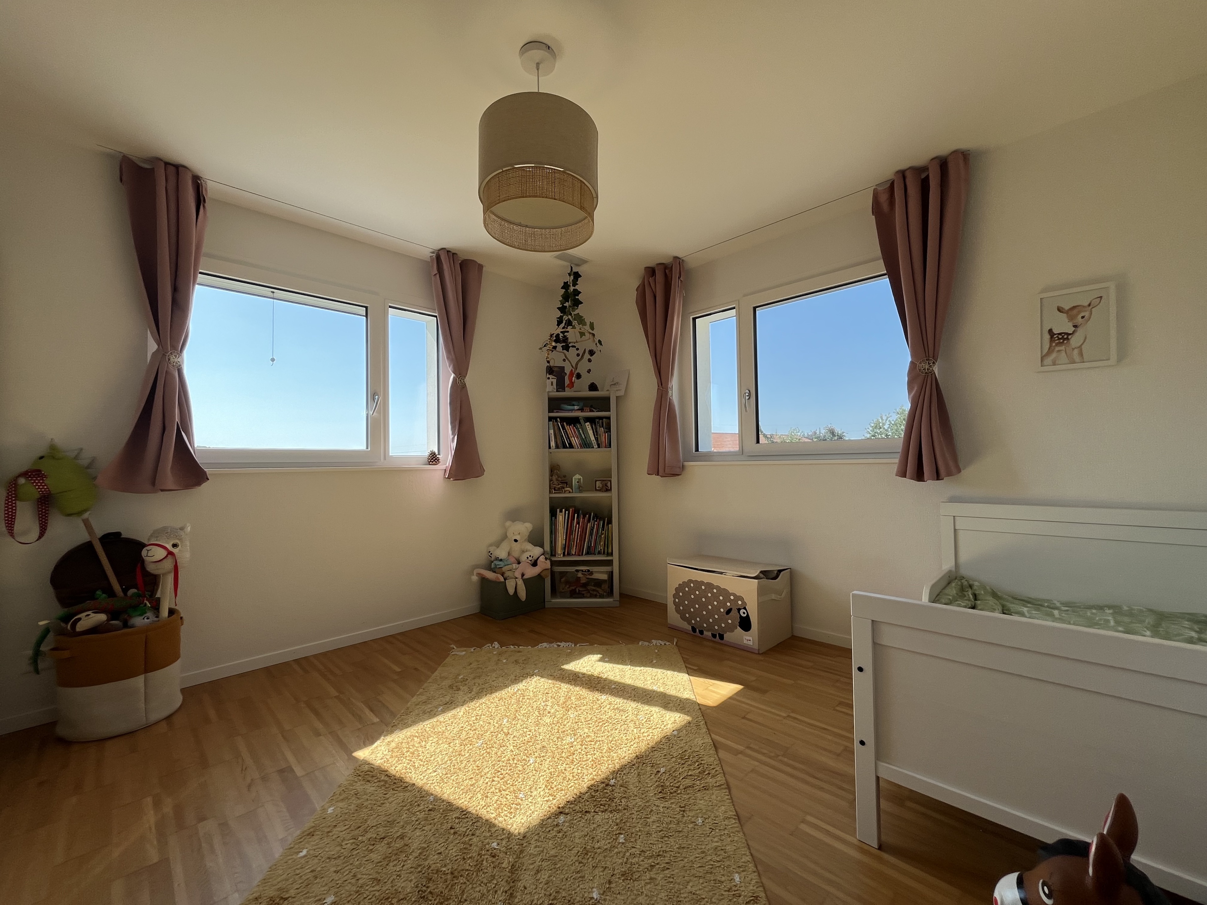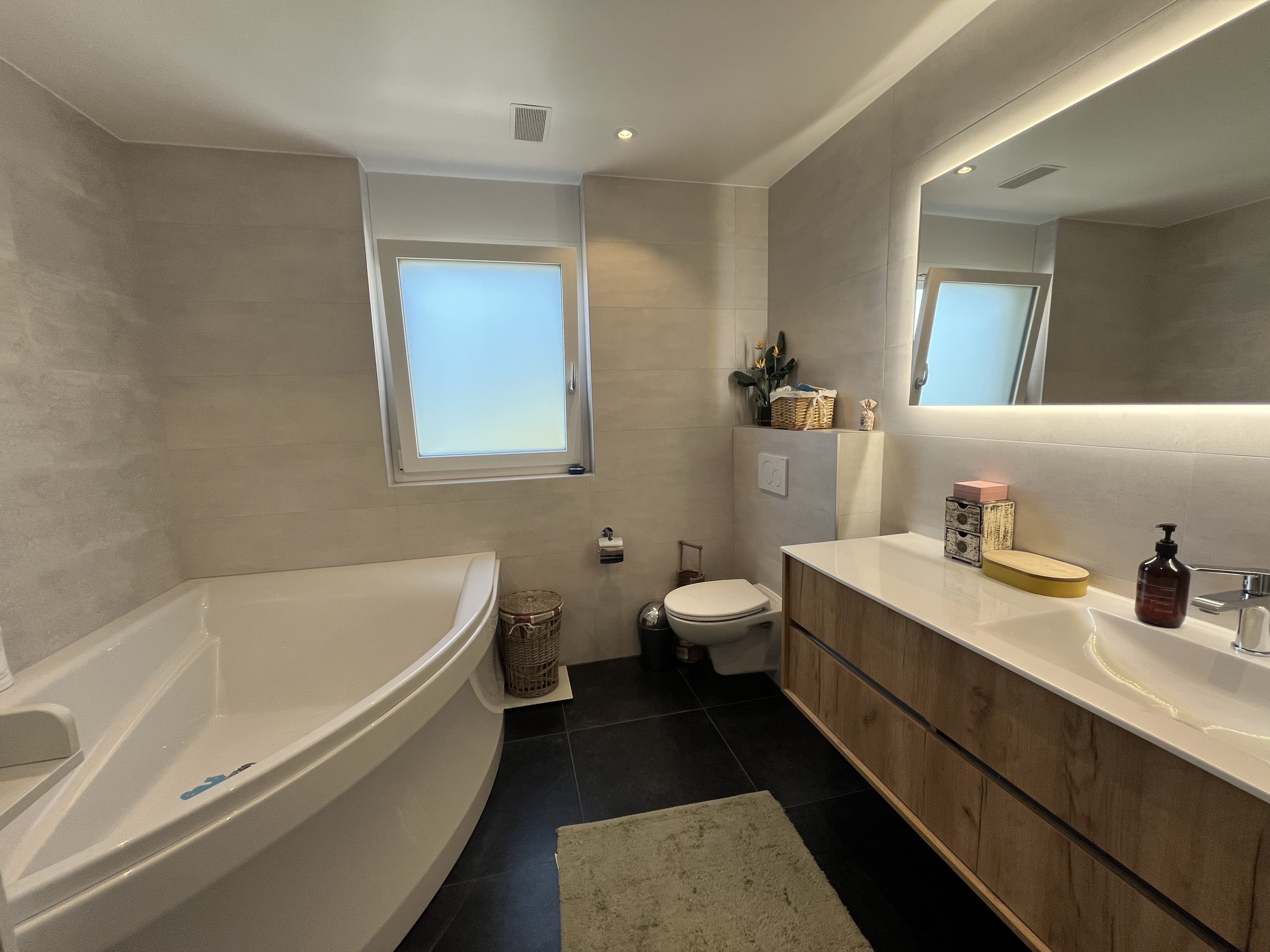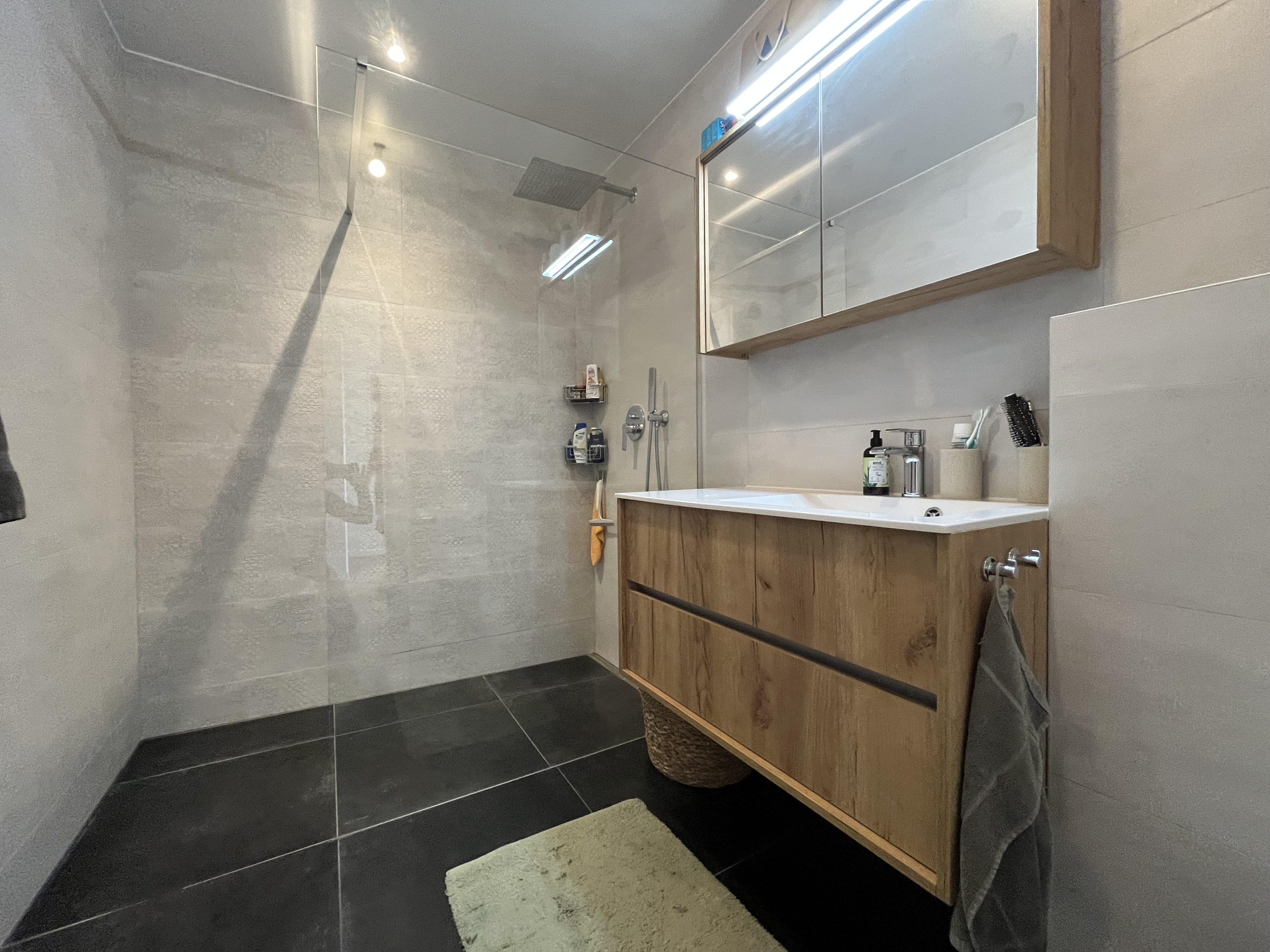 Un généreux hall d'entrée avec plusieurs armoires murales, un vaste espace séjour-salle à manger, une cuisine moderne, ouverte, entièrement équipée avec des matériaux de qualité, un îlot central, un réduit avec colonne de lavage, deux salles de bains (1x WC/baignoire/lavabo + 1x WC/douche italienne/lavabo) et trois belles chambres à coucher avec parquet massif au sol.