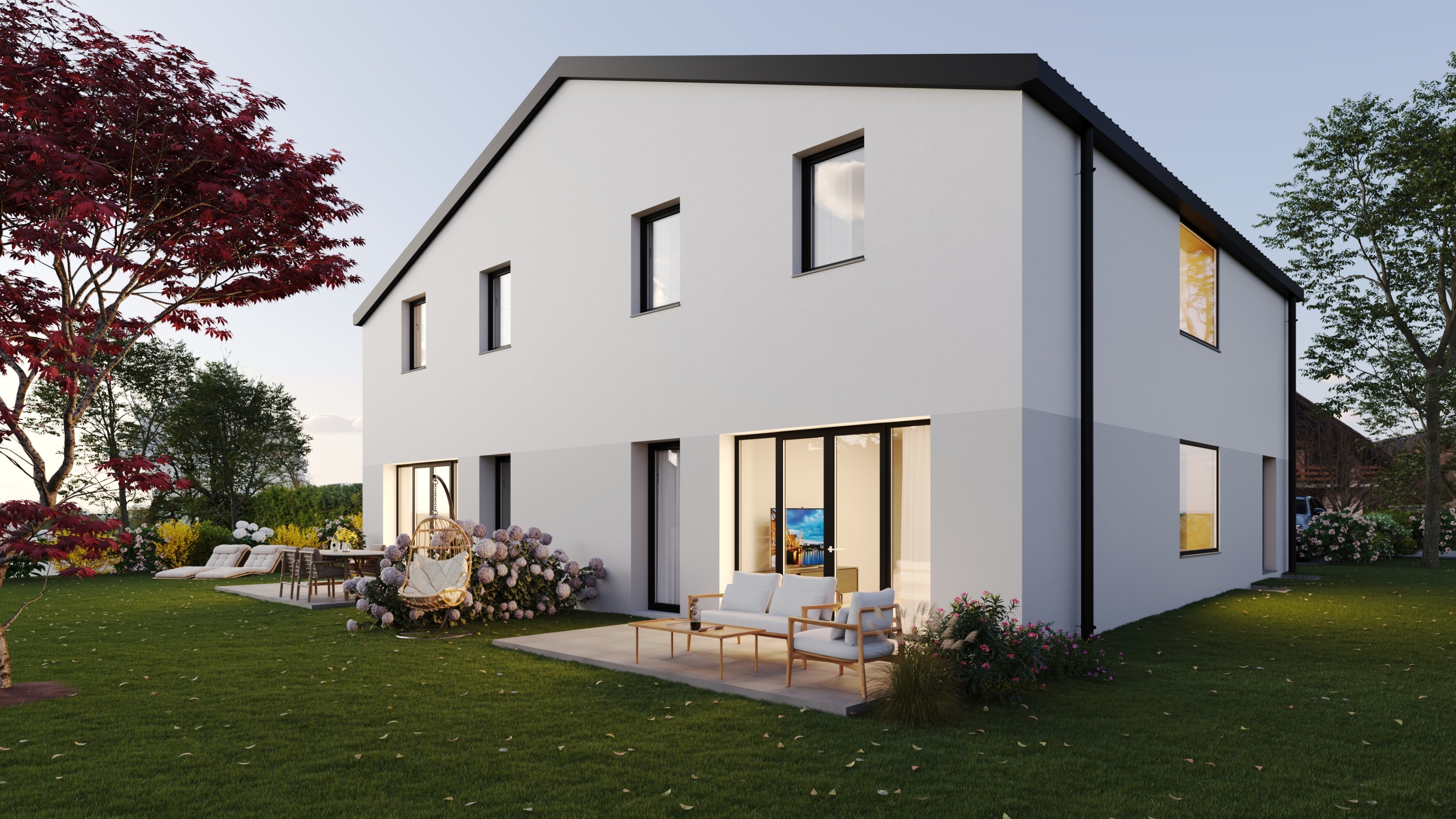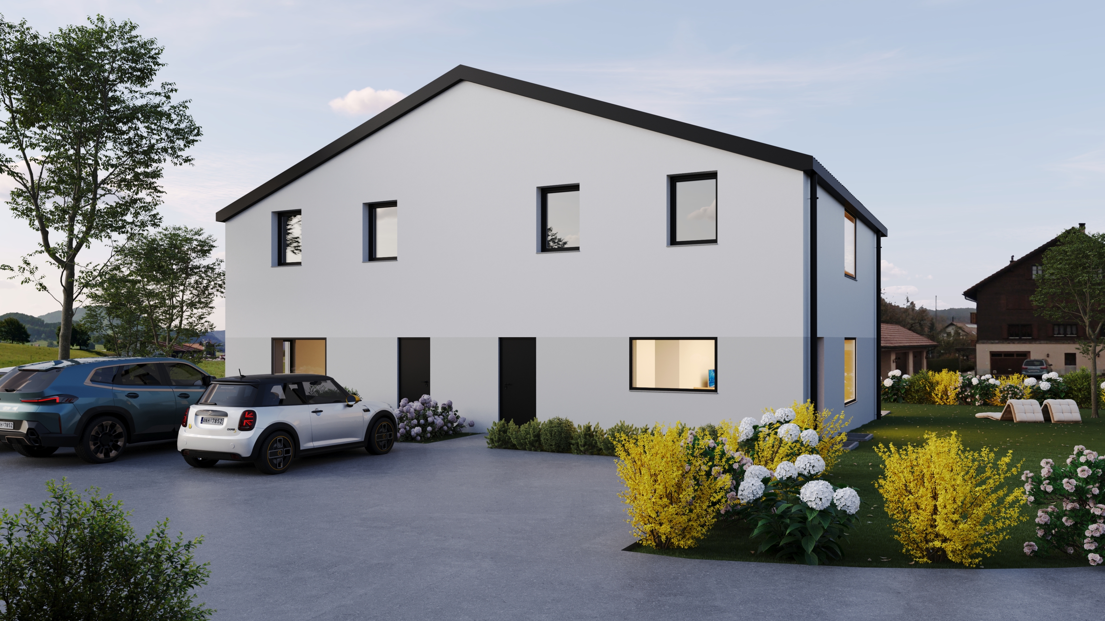 Cette nouvelle promotion est située au coeur du charmant village de Remaufens. Il s'agit d'une villa jumelle d'architecte (deux lots au total) sur une parcelle totale de 864m2.