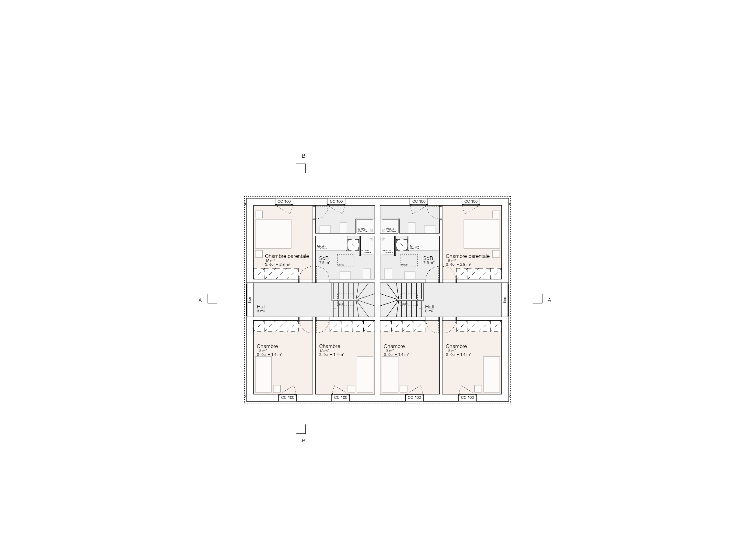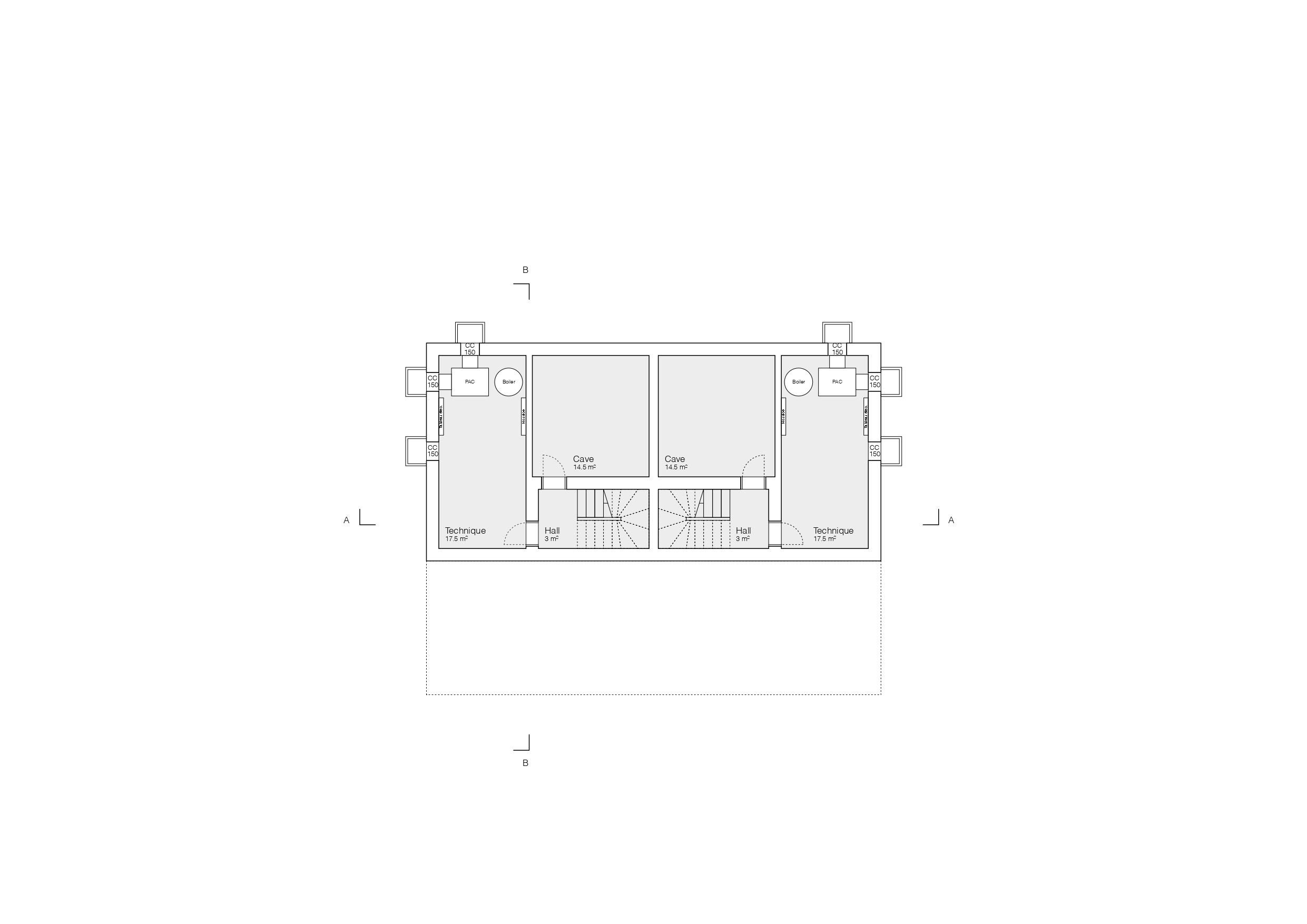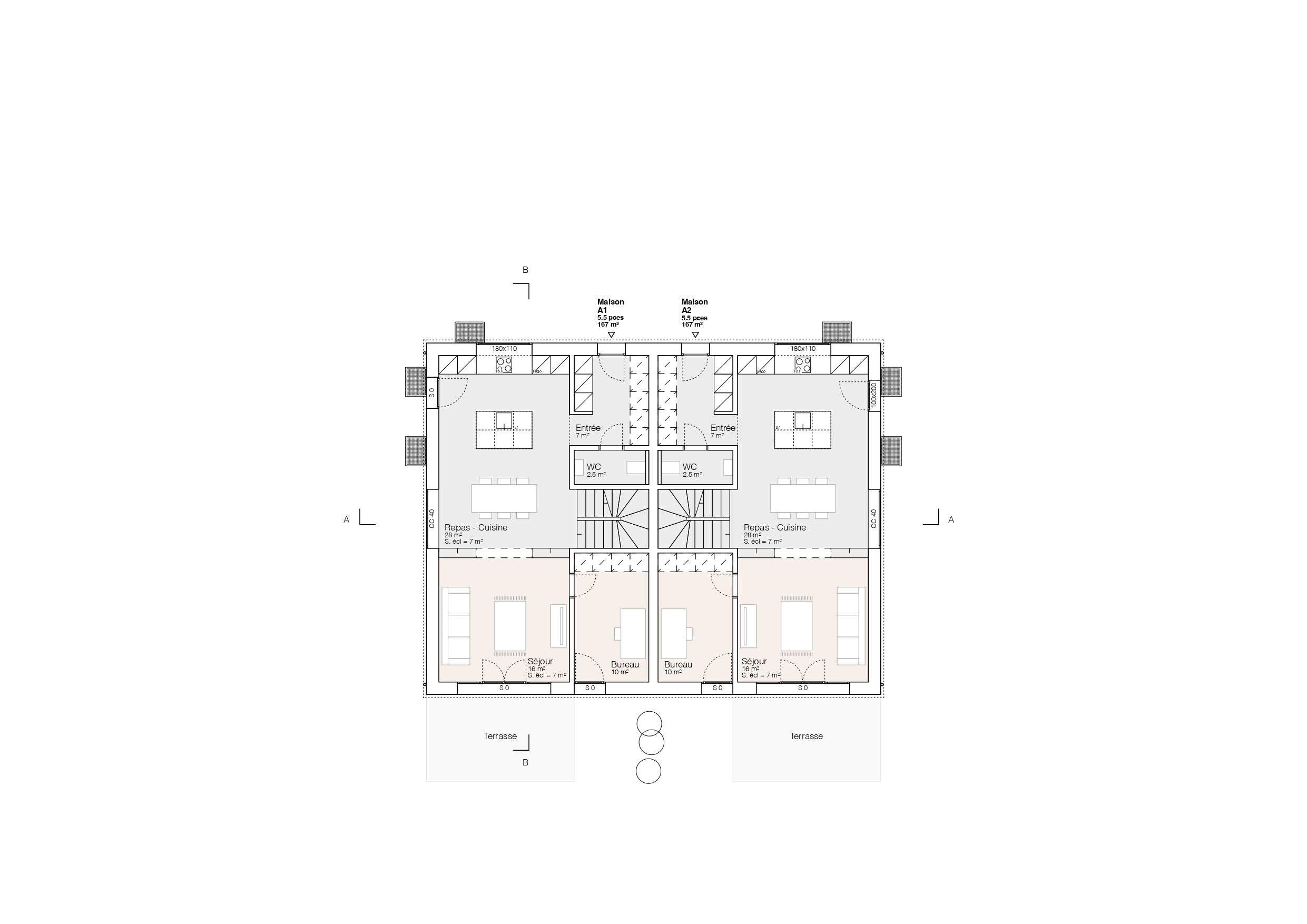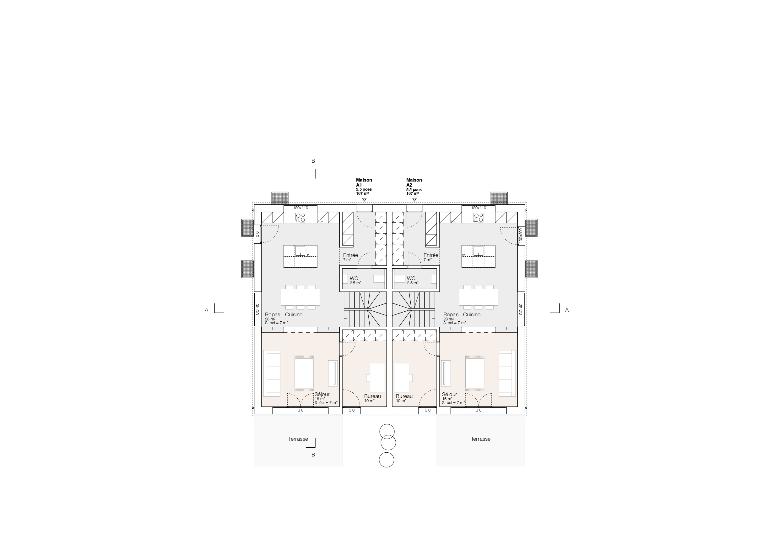 Chacune des deux maisons se compose ainsi: un vaste espace séjour, une cuisine ouverte sur une grande salle à manger, quatre belles chambres, un WC-visiteurs et deux salles de bain (1x WC/douche/lavabo + 1 WC/baignoire/lavabo).