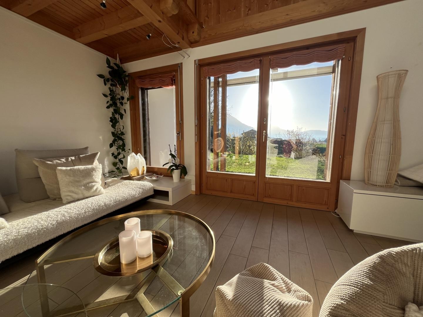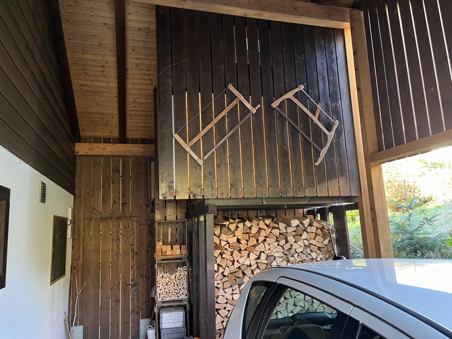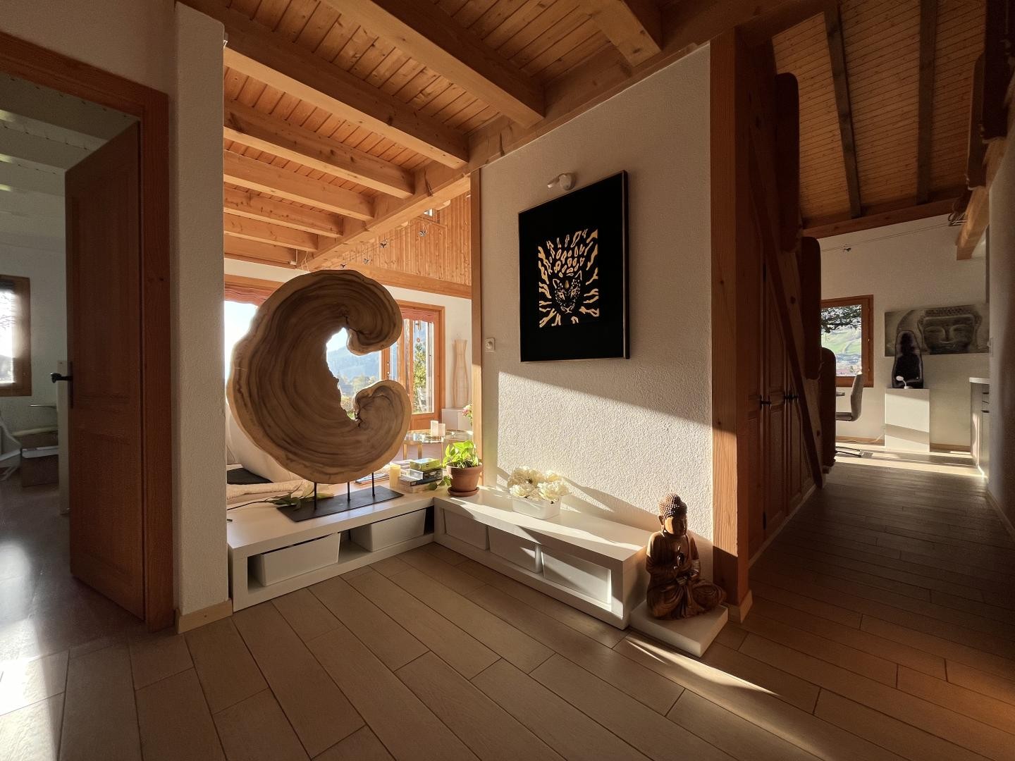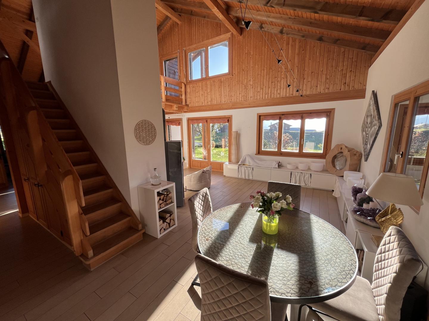 Divers locaux et espaces de rangement, un grand couvert à voiture avec mezzanine pour y stocker du bois, un balcon ainsi que deux magnifiques terrasses viennent compléter ce bien immobilier plein de charme et de cachet.