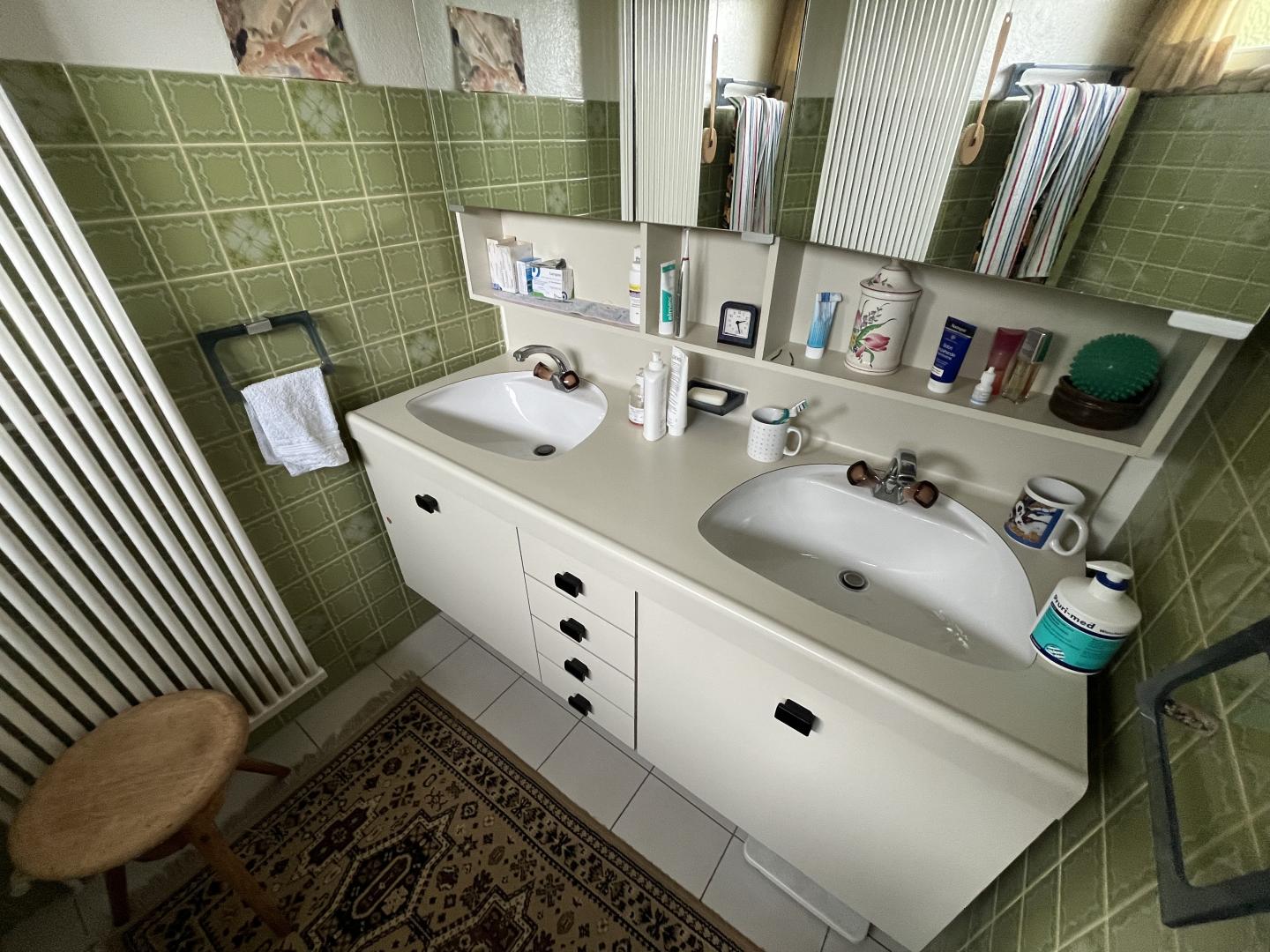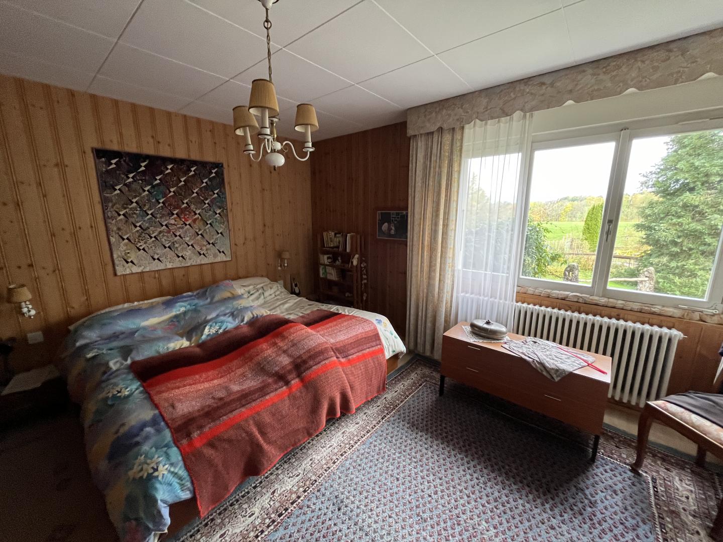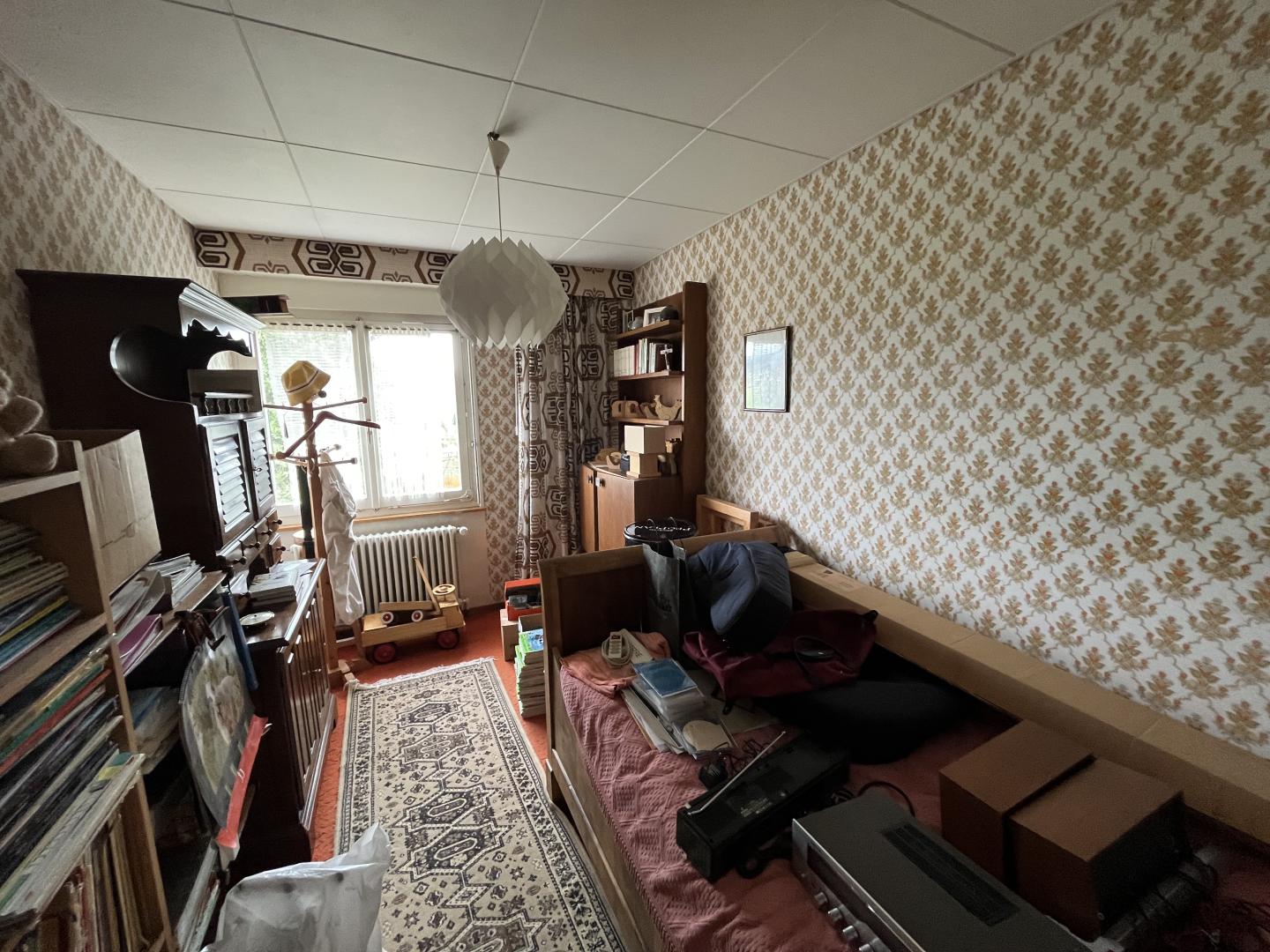 Ce bien immobilier, à vendre AVEC UN DROIT VIAGER, se compose ainsi: un généreux hall d'entrée, un vaste et lumineux espace séjour-salle à manger agrémenté d'une cheminée, une cuisine semi-ouverte, cinq pièces dont trois sont actuellement aménagées en chambre à coucher, deux salles de bain (1x WC/douche/baignoire + 1x WC/douche), un local technique avec buanderie et divers locaux-espaces de rangement. Accès à un grand galetas depuis la dernière pièce (escalier en bois).