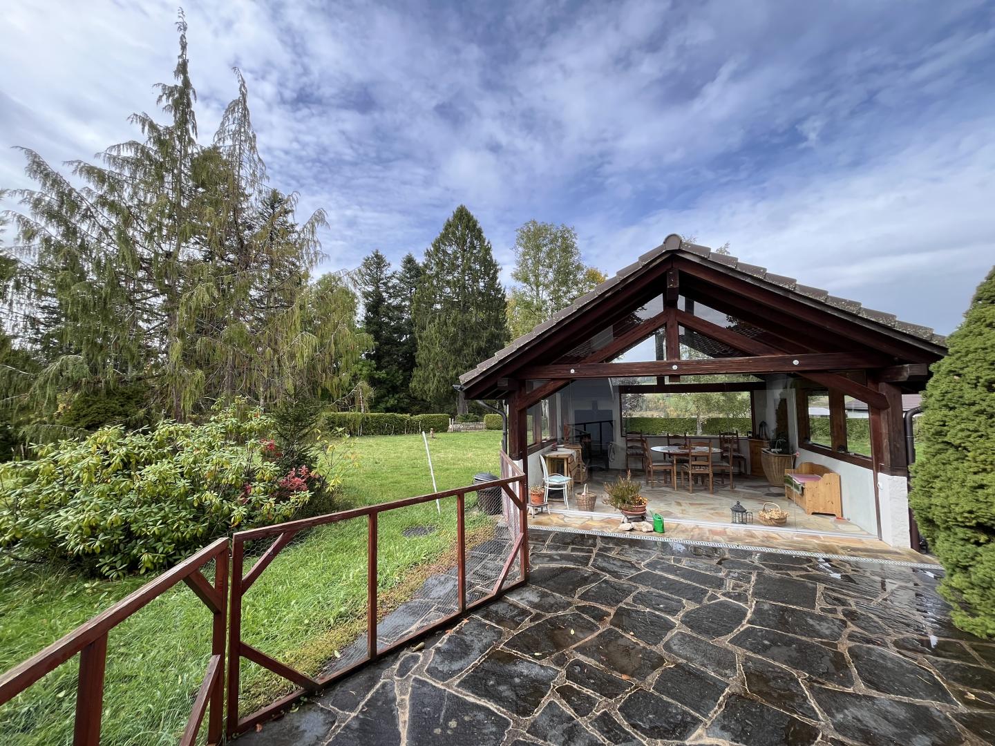 Cette magnifique maison, entièrement de plain-pied, est située dans un endroit calme et verdoyant, à proximité immédiate de la nature et de la forêt.